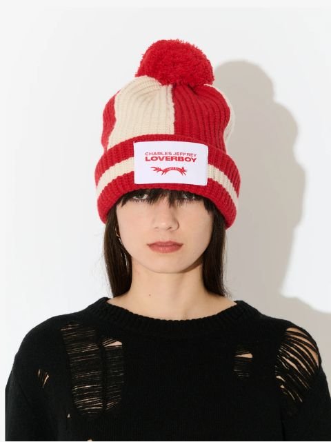 • Loverboy Pompom Beanie In Red Ecru $180.00